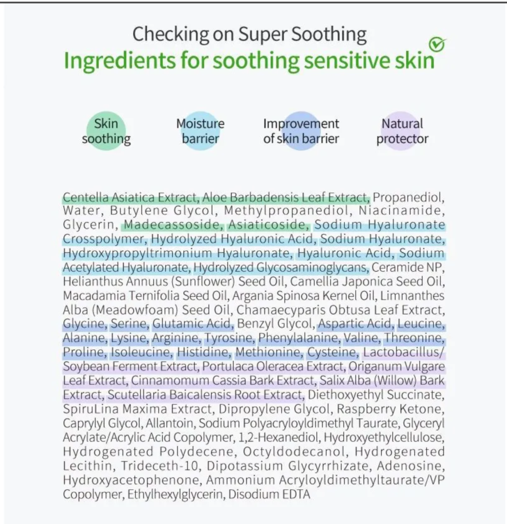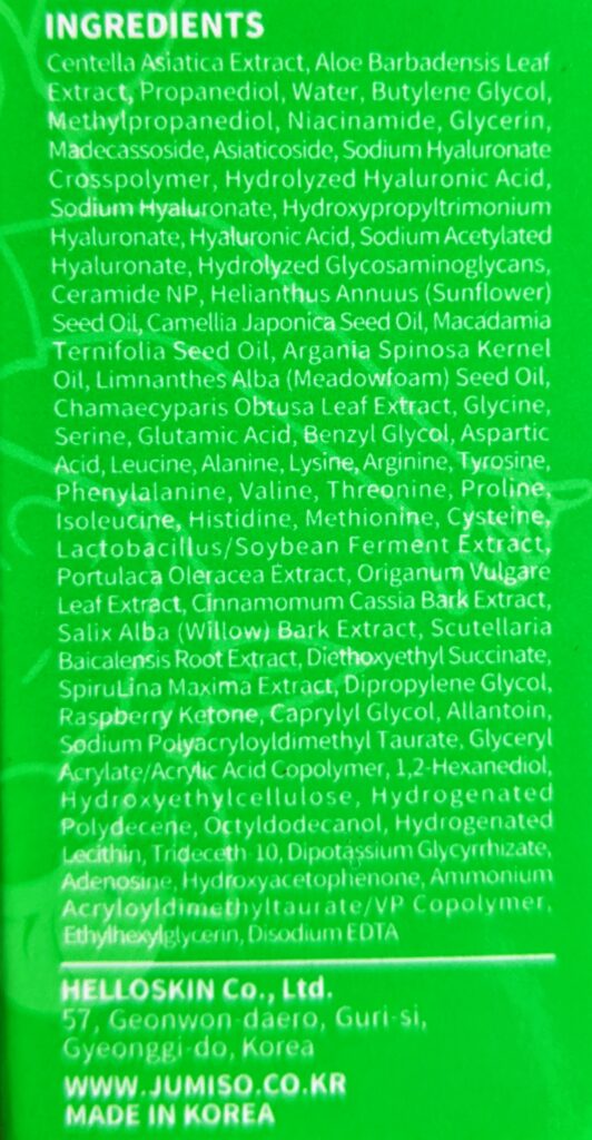 Centella Asiatica Extract, Aloe Barbadensis Leaf Extract, Propanediol, Water, Butylene Glycol, Methylpropanediol, Niacinamide, Glycerin, Madecassoside, Asiaticoside, Sodium Hyaluronate Crosspolymer, Hydrolyzed Hyaluronic Acid, Sodium Hyaluronate, Hydroxypropyltrimonium Hyaluronate, Hyaluronic Acid, Sodium Acetylated Hyaluronate, Hydrolyzed Glycosaminoglycans, Ceramide NP, Helianthus Annuus (Sunflower) Seed Oil, Camellia Japonica Seed Oil, Macadamia Ternifolia Seed Oil, Argania Spinosa Kernel Oil, Limnanthes Alba (Meadowfoam) Seed Oil, Chamaecyparis Obtusa Leaf Extract, Glycine, Serine, Glutamic Acid, Benzyl Glycol, Aspartic Acid, Leucine, Alanine, Lysine, Arginine, Tyrosine, Phenylalanine, Valine, Threonine, Proline, Isoleucine, Histidine, Methionine, Cysteine, Lactobacillus/Soybean Ferment Extract, Portulaca Oleracea Extract, Origanum Vulgare Leaf Extract, Cinnamomum Cassia Bark Extract, Salix Alba (Willow) Bark Extract, Scutellaria Baicalensis Root Extract, Diethoxyethyl Succinate, SpiruLina Maxima Extract, Dipropylene Glycol, Raspberry Ketone, Caprylyl Glycol, Allantoin, Sodium Polyacryloyldimethyl Taurate, Glyceryl Acrylate/Acrylic Acid Copolymer,1,2-Hexanediol, Hydroxyethylcellulose, Hydrogenated Polydecene, Octyldodecanol, Hydrogenated Lecithin, Trideceth-10, Dipotassium Glycyrrhizate, Adenosine, Hydroxyacetophenone, Ammonium Acryloyldimethyltaurate/VP Copolymer, Ethylhexylglycerin, Disodium EDTA